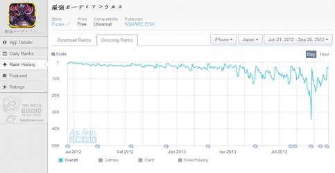 据统计,《Guardian Cross》是目前SE.除《百万亚瑟王》外,在日本Top Grossing榜单最高的游戏,历史最高排名第3位,虽然推出了1年多,但是目前Top Grossing(收入)仍然排在第32位 ,全球下载数已经超过2000万。