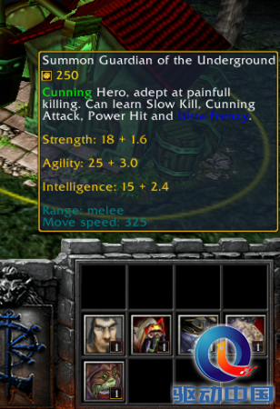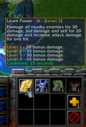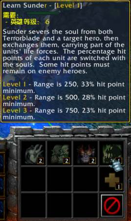 ①强力打击:对所有周围敌方单位造成30伤害,自己损失20点,并为下一次攻击造成额外20/35/50/65伤害。制作原理是疾风步,像死骑的大招一样,可以躲技能的。