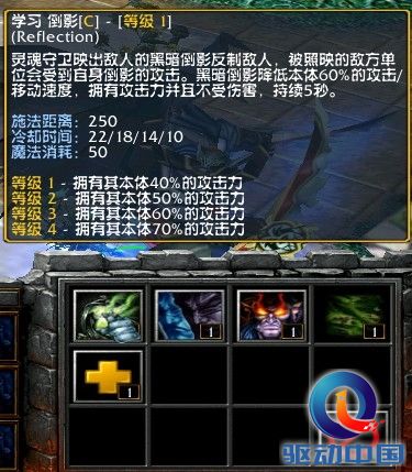 技能① 倒影:降低目标60%的攻速和移速,持续5秒,倒影有40/50/60/70%的攻击力。