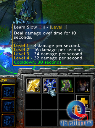 ②慢性死亡:对单位目标造成8/16/24/32的秒伤害,持续10秒。