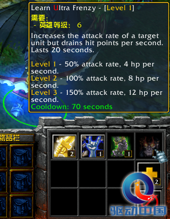 ④终极暴怒:增加一个目标50/100/150%的攻速,但是会损失4/8/12点每秒的生命值。