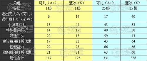 S级卡片封顶等级跟目前A+卡一致都是25级,但是跟A+有所差别的是,逃出无人岛属性项变成了通行费用打折,变得实用性更高,在踩到对手区域时能帮 我们有效节省费用,这一优势无疑变得十分明显。在剩下的六项中可儿一直被诟病的建设费用打折项上,蓝冰要高出21点,蓝冰总体属性比A+可儿要均衡的多, 可儿的最高项和最低项落差达到了49点,而蓝冰只是区区26点~