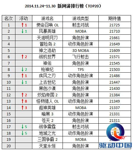 11-20名,《怪物猎人OL》同样是因为在TGC上公布了中国主题怪物以及测试时间后受到了玩家的关注,本期大涨8位冲回了榜单前20位。《炽焰帝国2》和《超神英雄》本期同样涨势明显。下滑方面。《战争雷霆》和《地城之光》本期双双下滑5位。